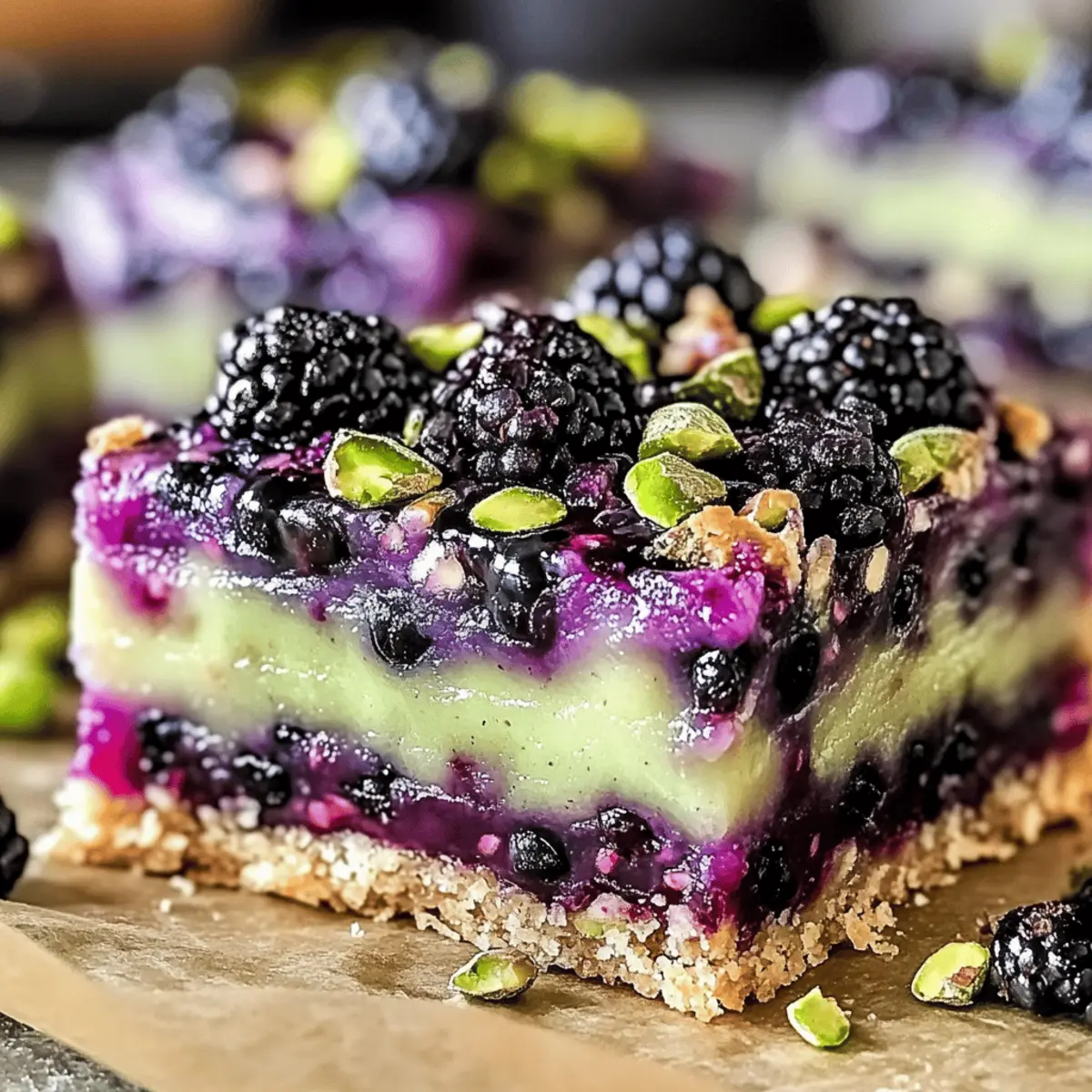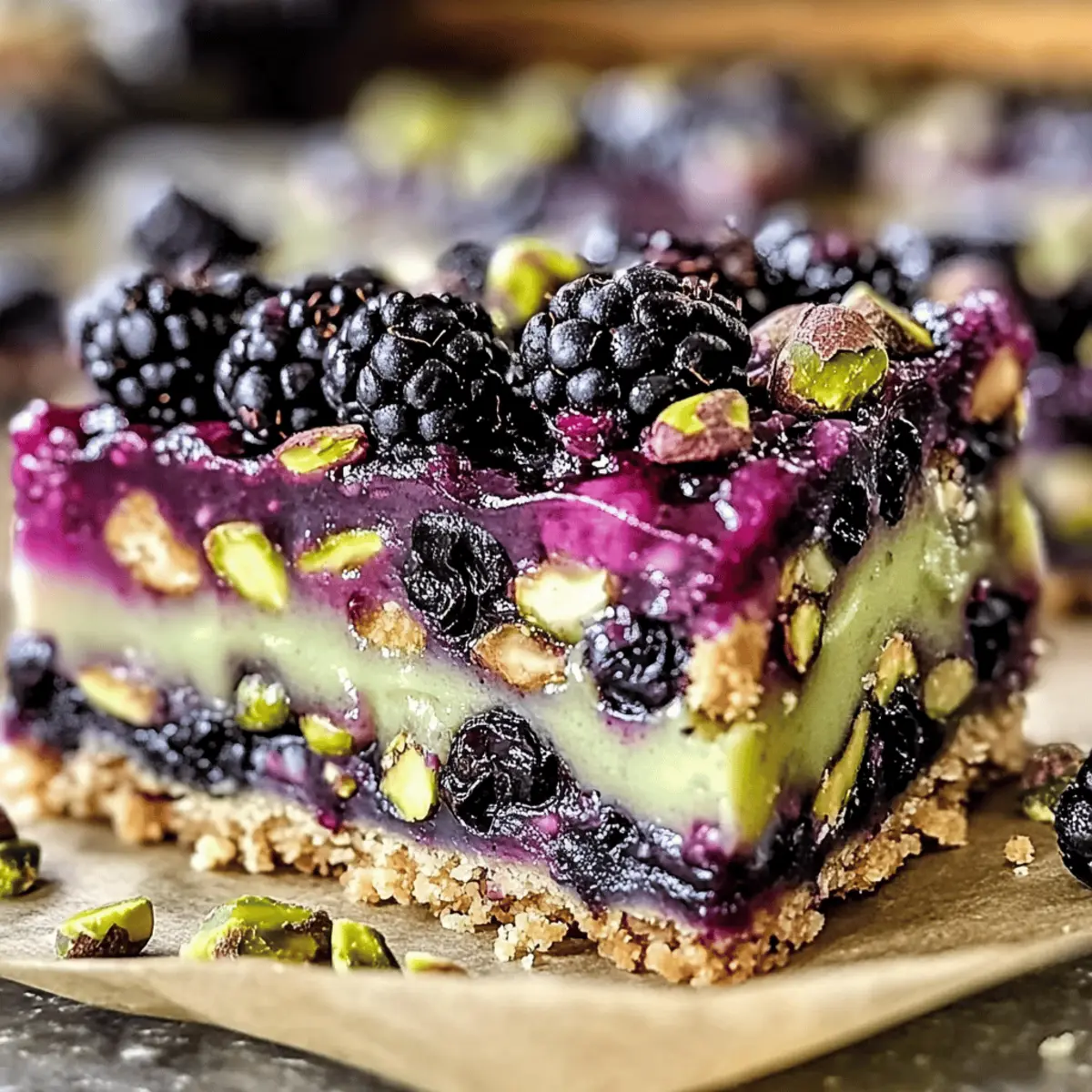 These Blackberry Pistachio Dream Bars are a sweet-tart delight, combining fresh blackberries and crunchy pistachios on a buttery crust.