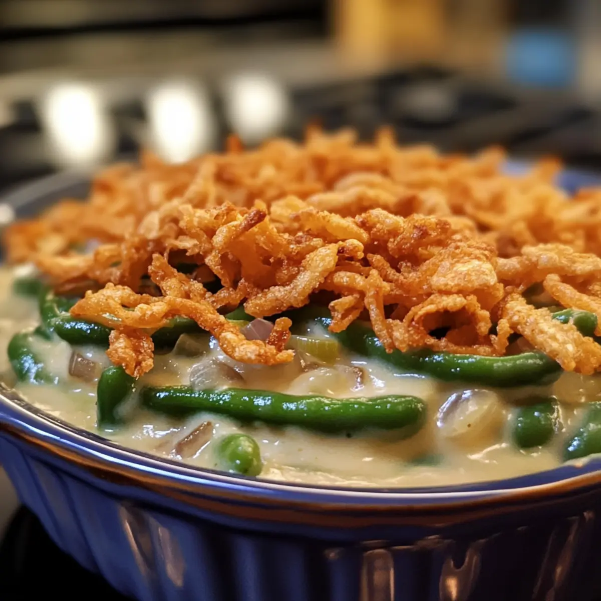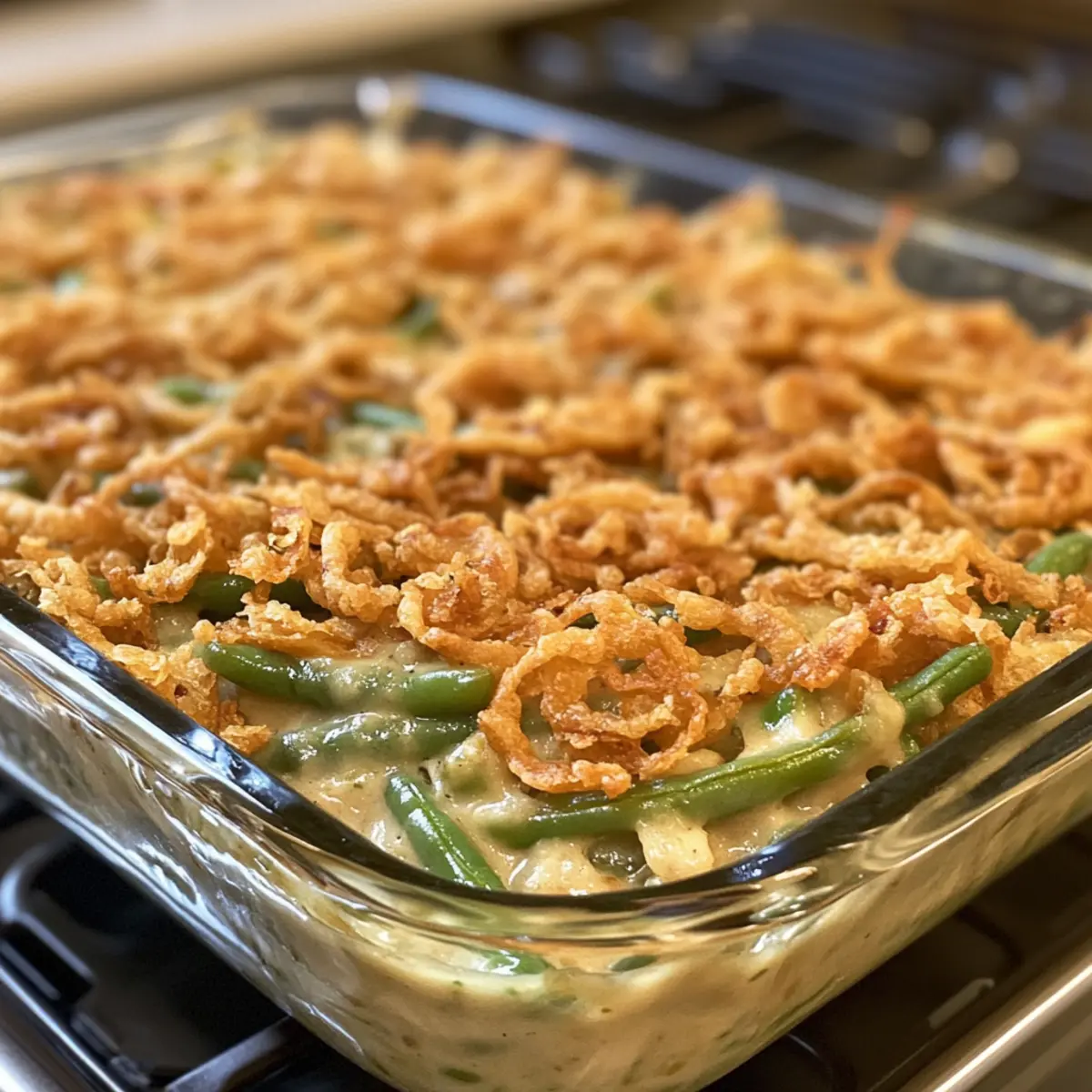 - Once baked, gently stir the casserole to mix the green beans, then sprinkle the remaining fried onions generously on top. Return the dish to the oven for an additional 5 minutes.