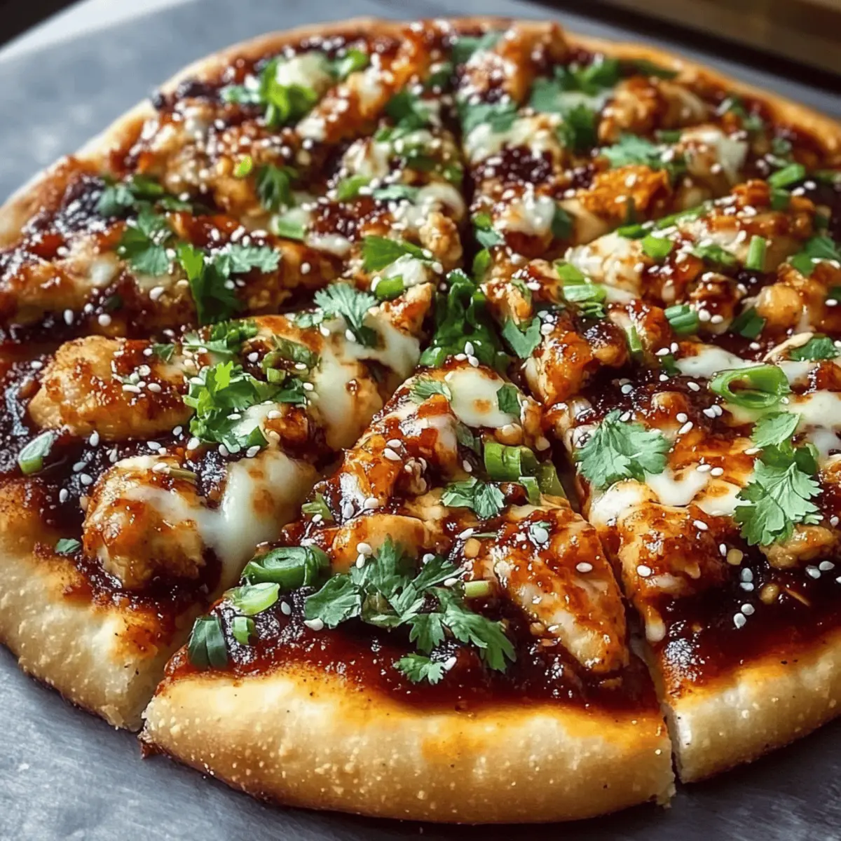 Once baked, allow your pizza to cool slightly before garnishing it with fresh cilantro, sliced green onions, and a sprinkle of sesame seeds. Slice into wedges, serve hot, and delight in the warm, comforting flavors of your homemade Chili Garlic Chicken Pizza.