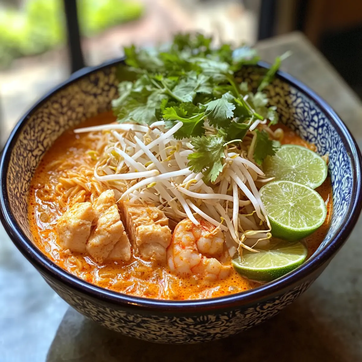 Ladle the piping hot soup into bowls, ensuring an even distribution of noodles, chicken, and shrimp. Garnish each serving with fresh bean sprouts, sliced cucumber, lime wedges, and chopped cilantro for added freshness and crunch. Your warm, vibrant Coconut Curry Soup with Rice Noodles is now ready to be enjoyed!