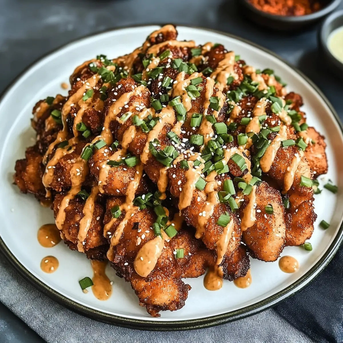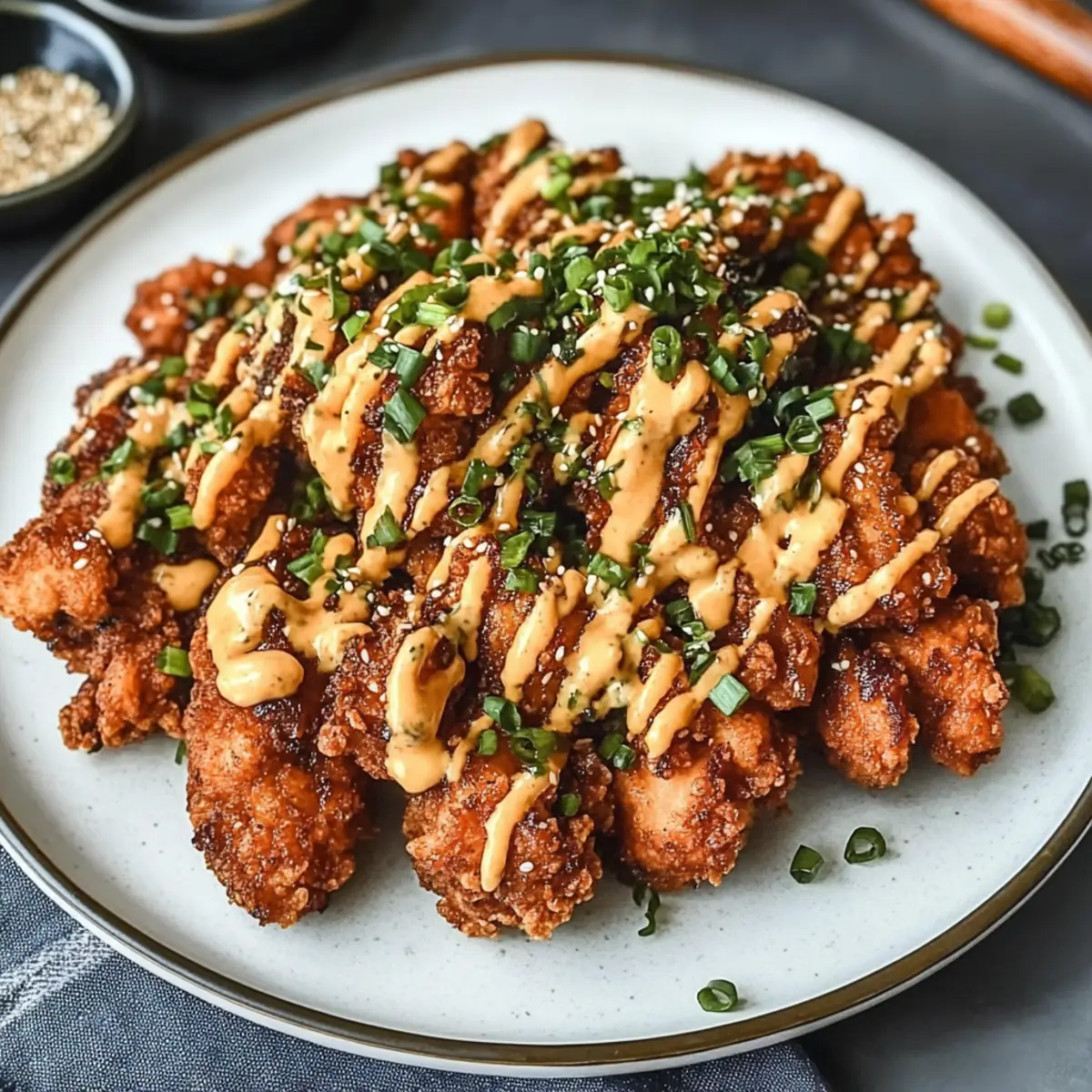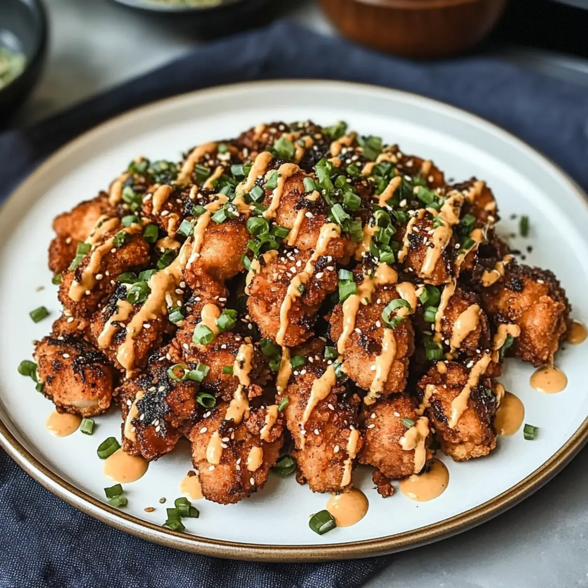 - Garnish and Serve: Serve the crispy chicken hot with spicy mayo and a sprinkle of furikake.