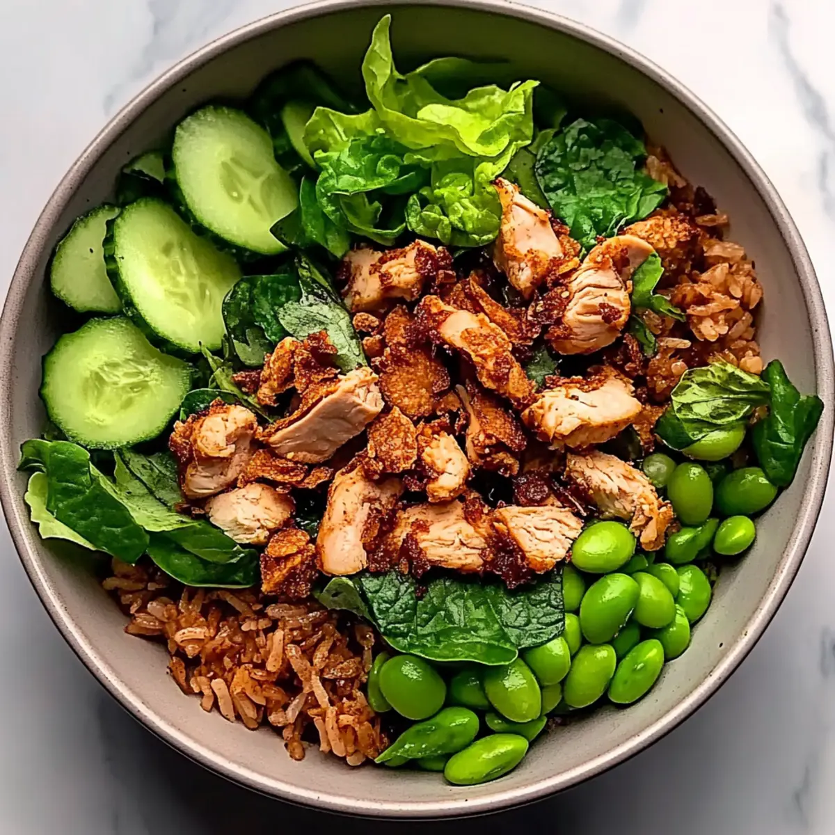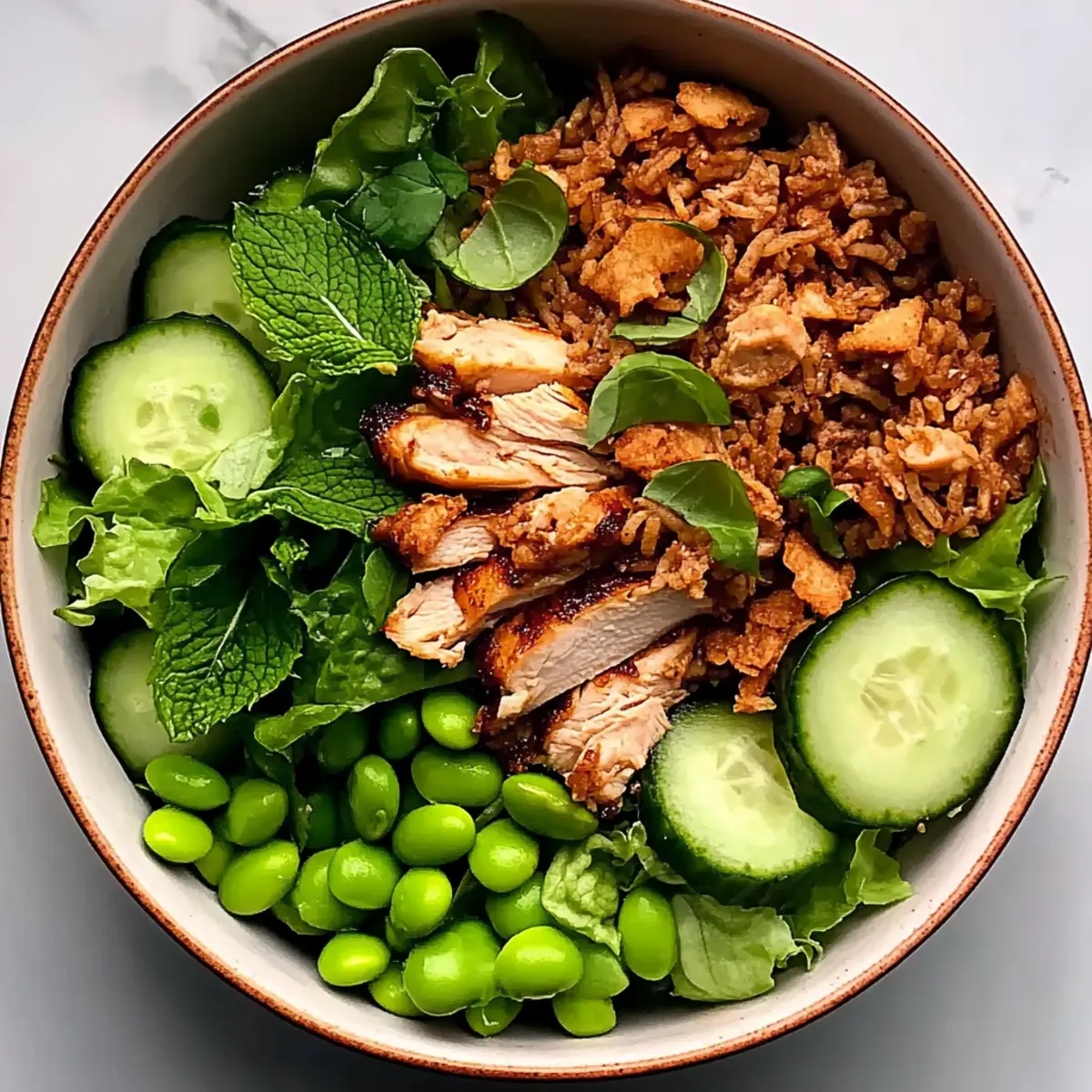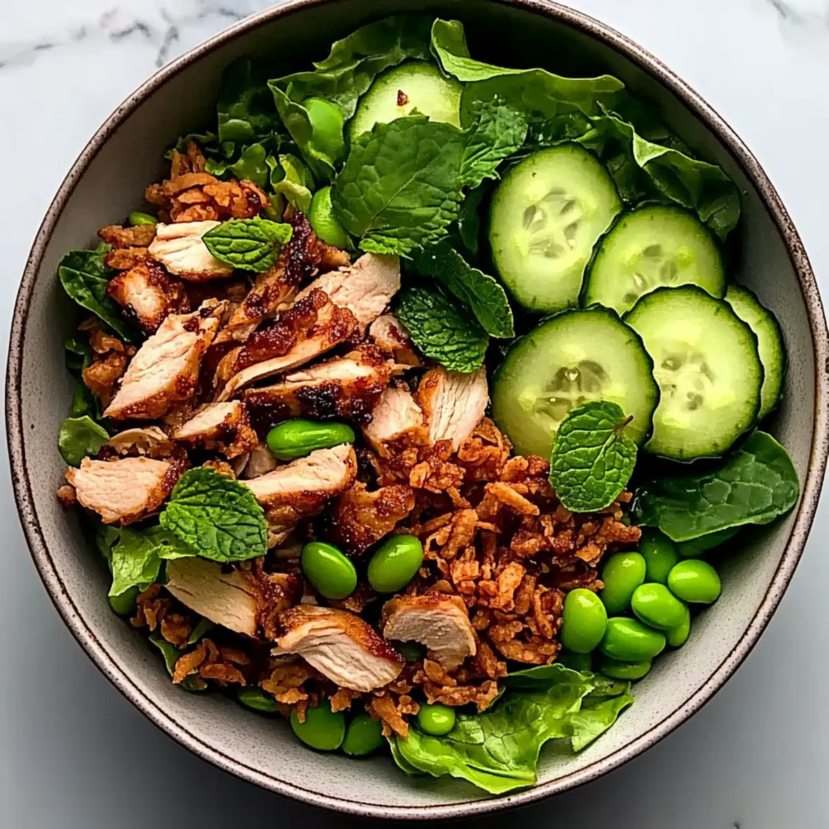 - In a large bowl, mix cooked chicken, shredded iceberg lettuce, diced cucumbers, fresh mint, spring onions, and edamame. Drizzle with dressing.