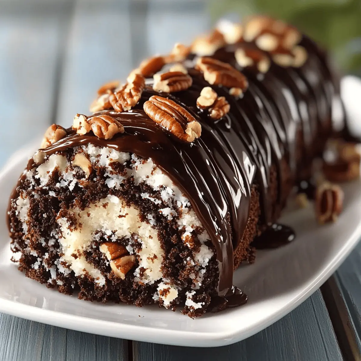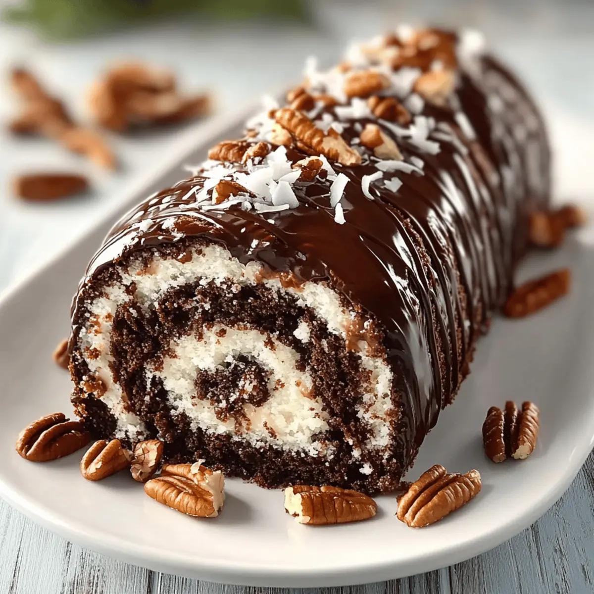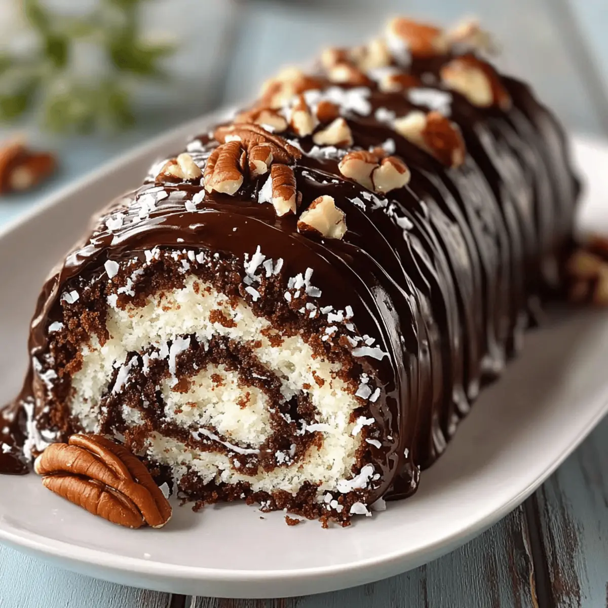 This German Chocolate Cake Roll features a rich chocolate sponge, coconut-pecan filling, and silky ganache, making it an indulgent treat for any occasion.