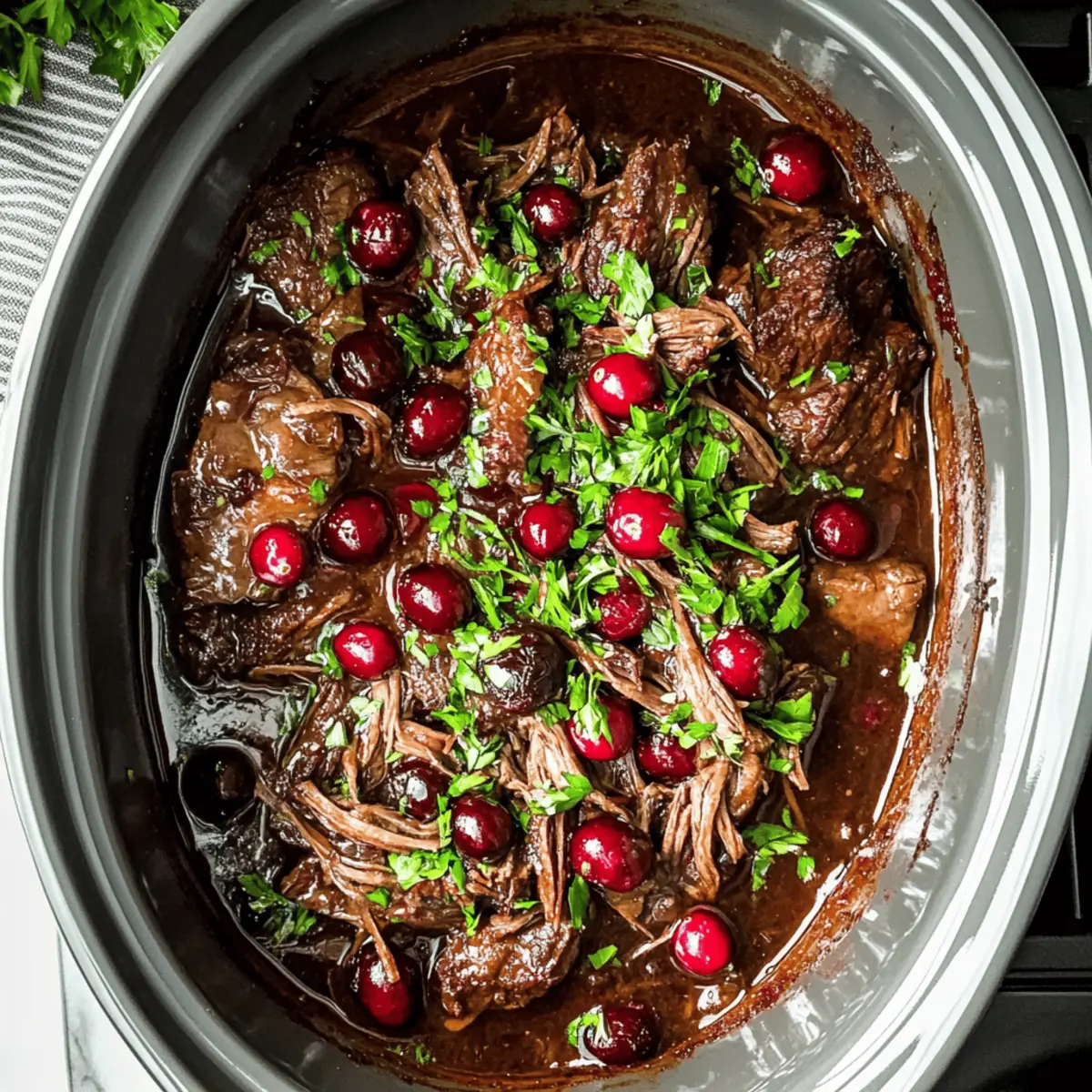 For an extra touch of festive flair, garnish the shredded pot roast with freshly chopped parsley. This adds not only color but also a hint of freshness against the rich flavors of the dish. Pair your Juicy Christmas Cranberry Pot Roast with sides like mashed potatoes or roasted veggies, making sure to soak in all the delightful sauce.