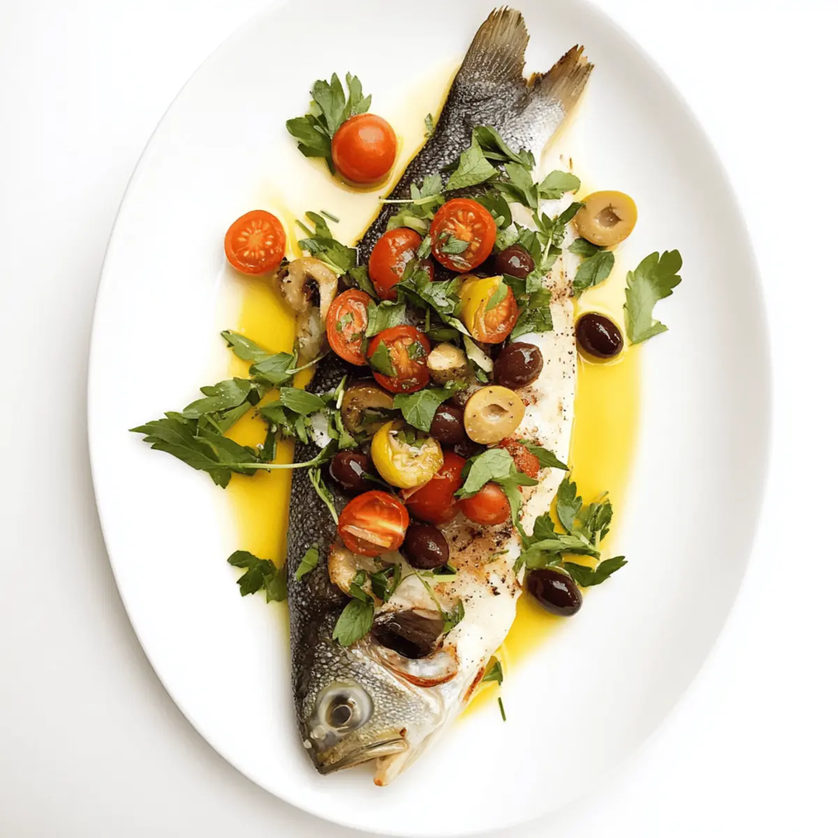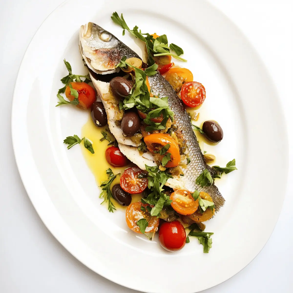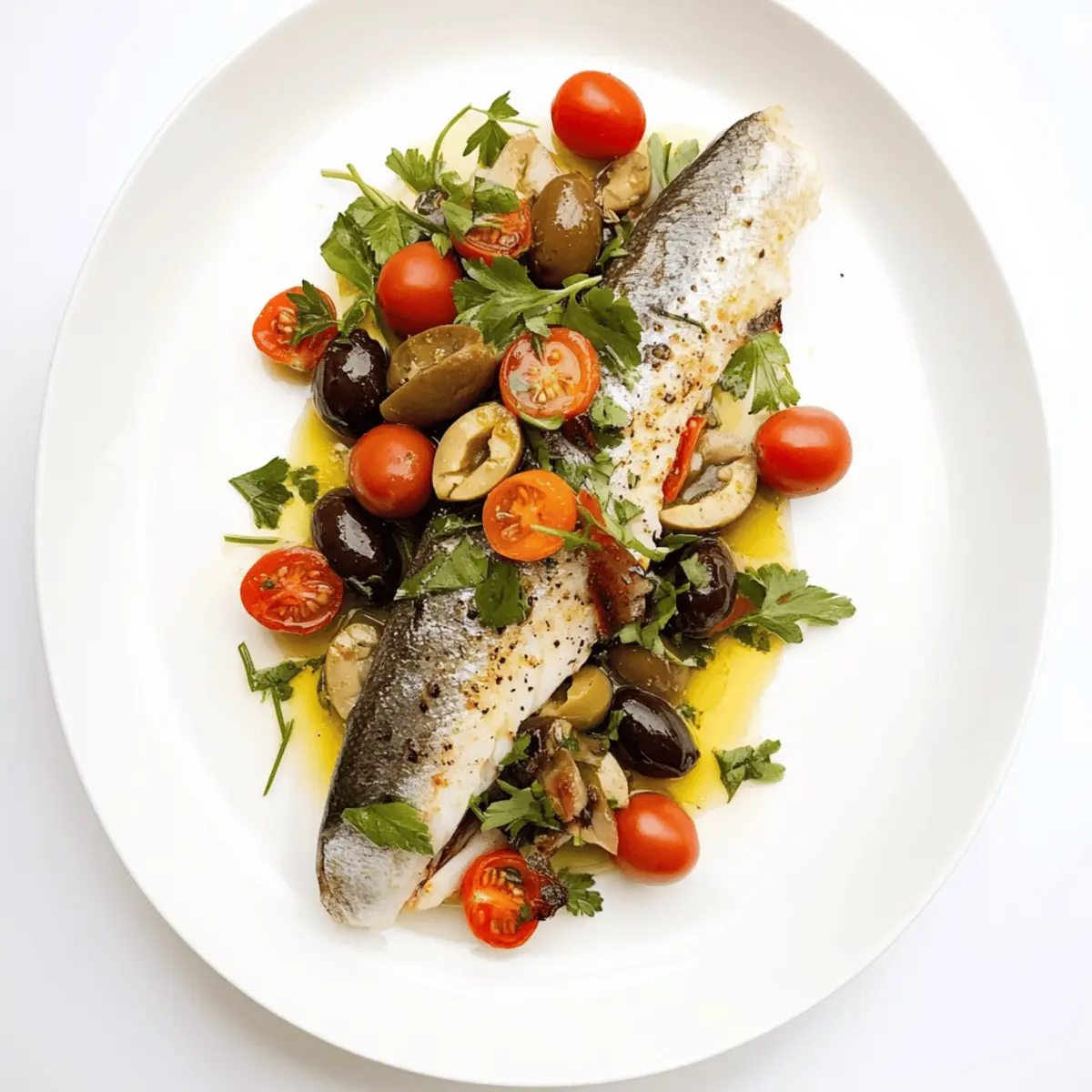Once cooked, remove the Pan-Seared Branzino fillets from the skillet and place them on a serving platter. Generously spoon the vibrant olive and tomato relish over each fillet, allowing the colors to pop. Consider garnishing with additional fresh parsley for a burst of color and flavor, and serve immediately for the best taste and texture.