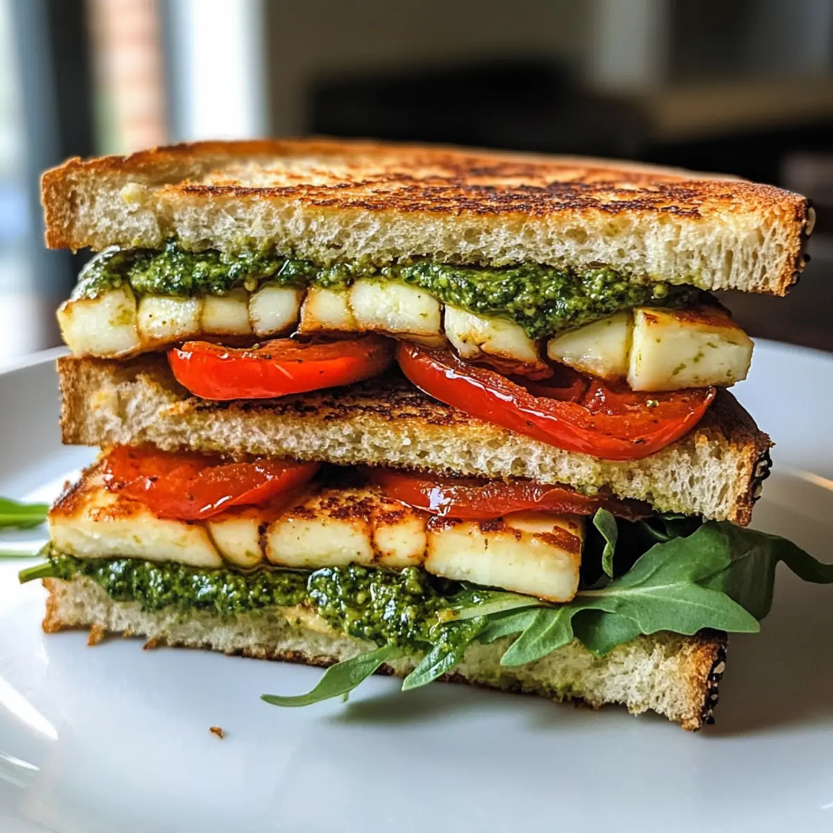 - Spread a generous layer of pesto hummus on one slice of toasted bread. Layer with halloumi, red onion, arugula, and roasted red peppers. Sprinkle red pepper flakes, then top with another slice of bread and press gently.