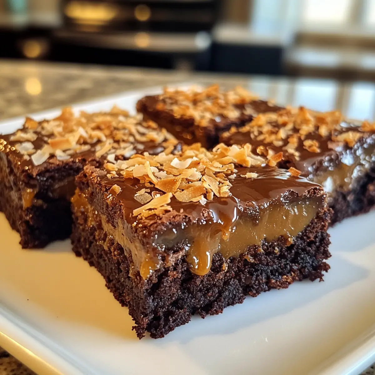 - Drizzle caramel topping over the cooled brownies and sprinkle toasted coconut on top.