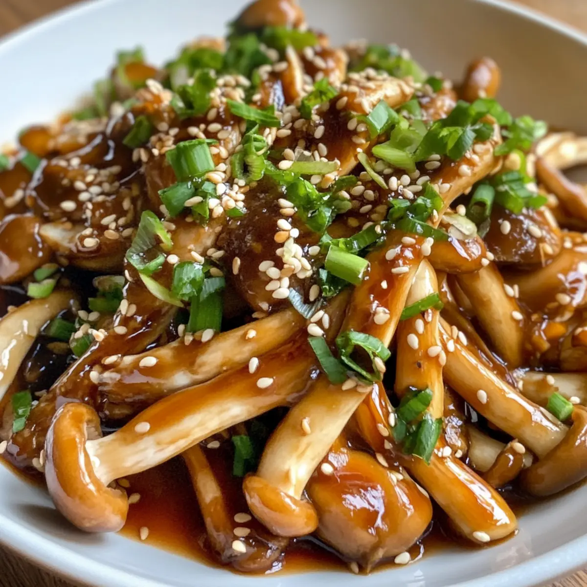 - Remove from heat and transfer the mushrooms to a serving dish. Garnish with chopped green onions and toasted sesame seeds. Serve immediately.