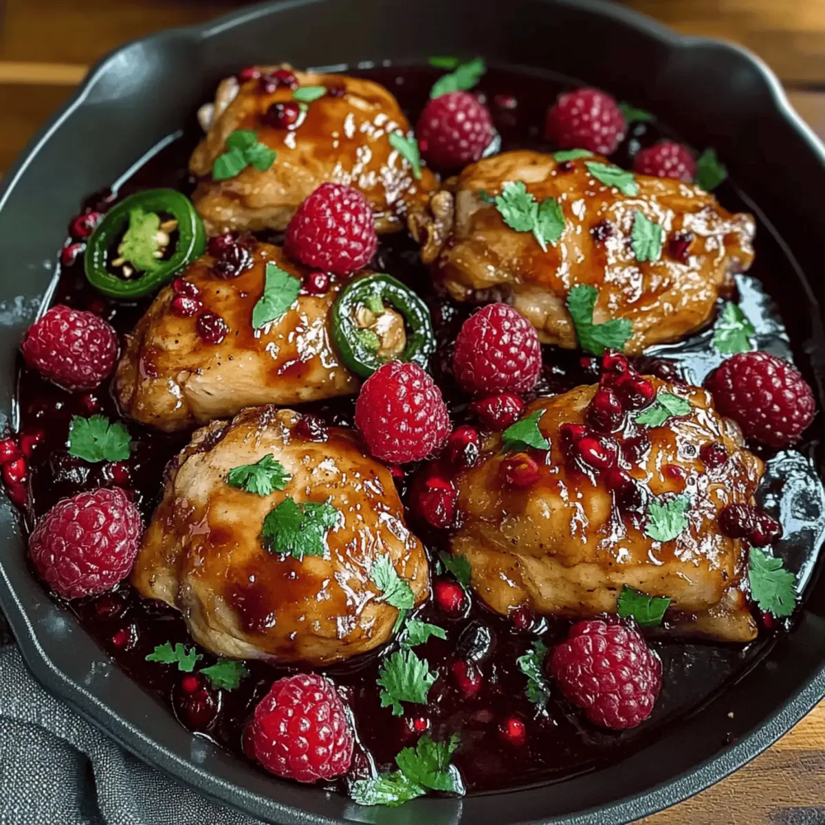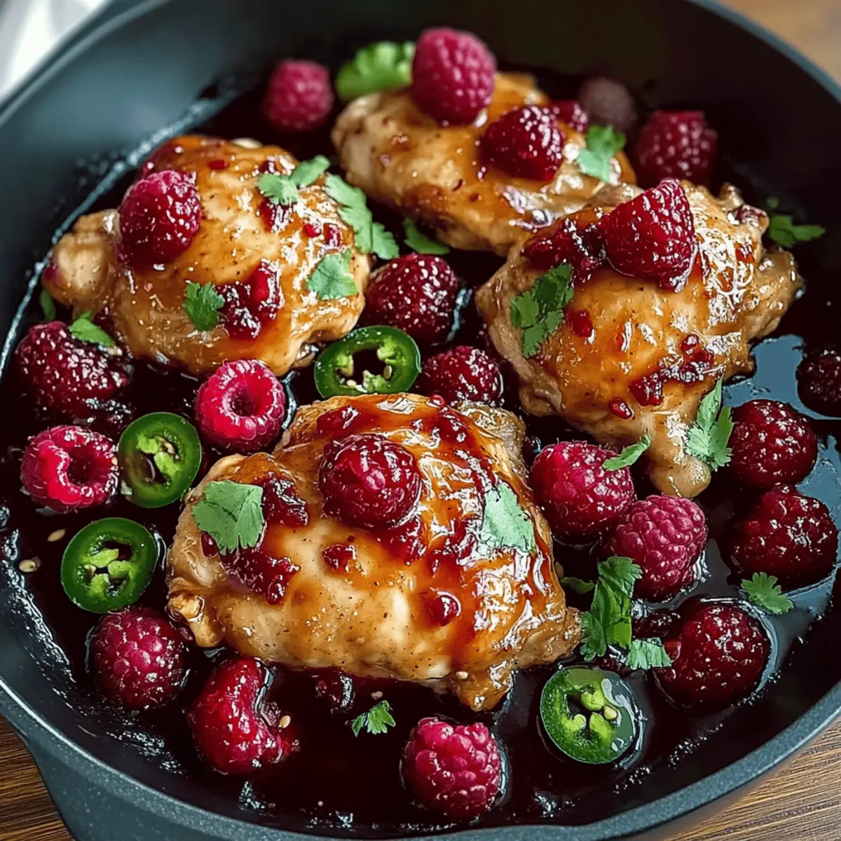 - Plate the chicken, drizzling remaining glaze on top. Garnish with fresh raspberries and serve immediately.