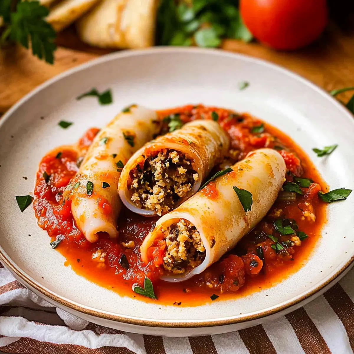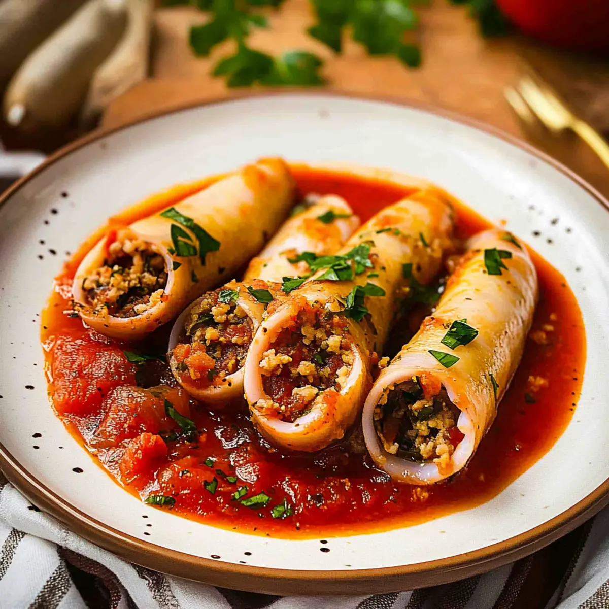 As the aroma of sautéed garlic fills the kitchen, I can’t help but remember those sun-soaked afternoons spent sharing meals with loved ones in Italy. Today, I’m excited to recreate a classic Italian delight: Stuffed Squid in Tomato Sauce. This dish is not only a beautiful way to showcase seafood but also comes together with ease, making it perfect for both casual family dinners and elegant gatherings. Tender squid, infused with fresh herbs and Pecorino Romano cheese, melds beautifully with a rich, savory tomato sauce. This recipe brings the Mediterranean flavors right to your table, allowing you to enjoy the comfort of homemade food without the fuss. Are you ready to dive into a dish that will impress your taste buds and elevate your culinary repertoire? Let’s get cooking!