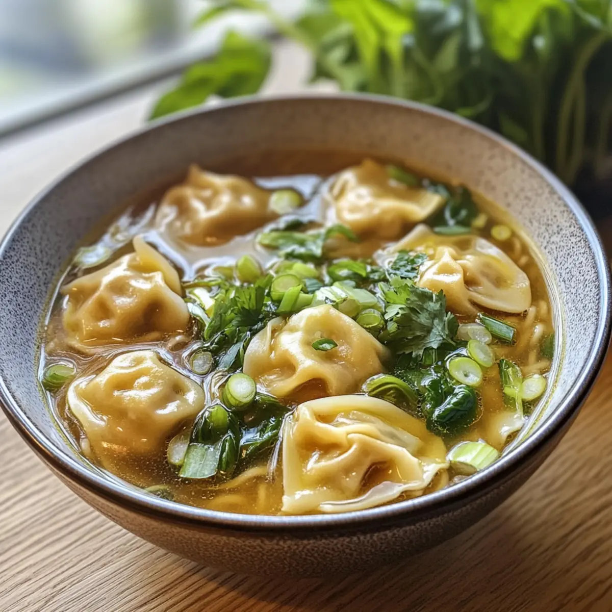 Ladle the warm Vegan Wonton Noodle Soup into bowls, ensuring each has a good amount of noodles, wontons, and greens. Garnish with chopped scallions, fresh cilantro, and a drizzle of chili oil if desired. Each bowl is now ready to offer a heartwarming, nourishing experience!